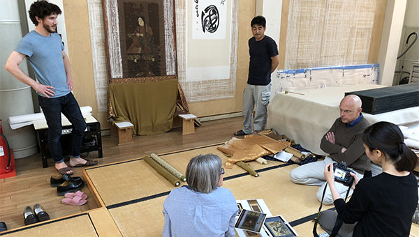 世界の文化財保存関係者を対象とした国際研修事業に協力しています。装潢修理技術の指導に加え、和紙を始めとする日本の伝統材料や道具類の紹介など、技術交流や選定保存技術の広報活動を行っています。