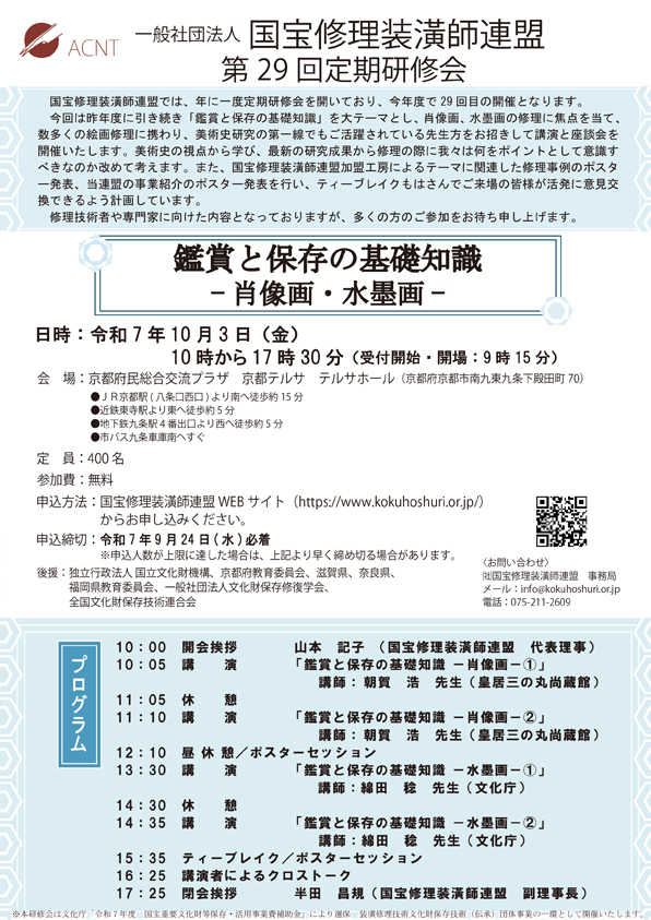今年度は昨年度に引き続き「鑑賞と保存の基礎知識」を大テーマとし、肖像画、水墨画の修理に焦点を当て、美術史の視点から学ぶ会とします。数多くの絵画修理に監督として携わり、美術史研究の第一線でもご活躍されている先生方にご講演いただくことで、最新の研究成果から修理の際に我々が何をポイントとして意識すべきなのか改めて考えます。そのほか、各加盟工房によるテーマに沿った修理事例の報告と、当連盟の事業紹介のポスター発表を行い、ティーブレイクもはさんでご来場の皆様が活発に意見交換できるよう計画しています。